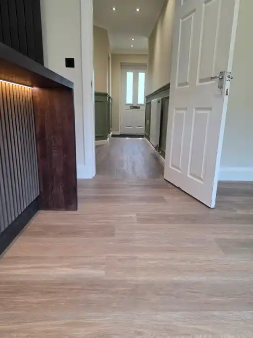 In the kitchen, the flooring provides a hard-wearing, easy-to-maintain surface, ideal for everyday use. The same plank LVT flooring was continued into the hallway, helping to create a consistent and modern look throughout the space.