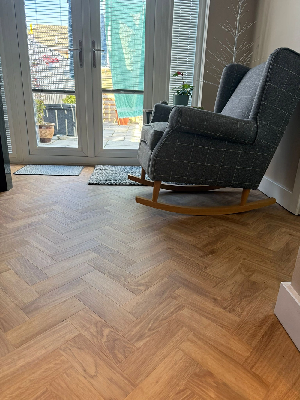 We recently installed Tarkett Luxury Vinyl Tile (LVT) in a wood effect herringbone pattern for a home in Huddersfield, transforming both the kitchen and entrance areas. The herringbone layout adds classic style while the durable LVT construction ensures the flooring stands up to daily use. Offering the warmth of wood with the easy maintenance of vinyl, this installation provided the perfect balance of practicality and design.
